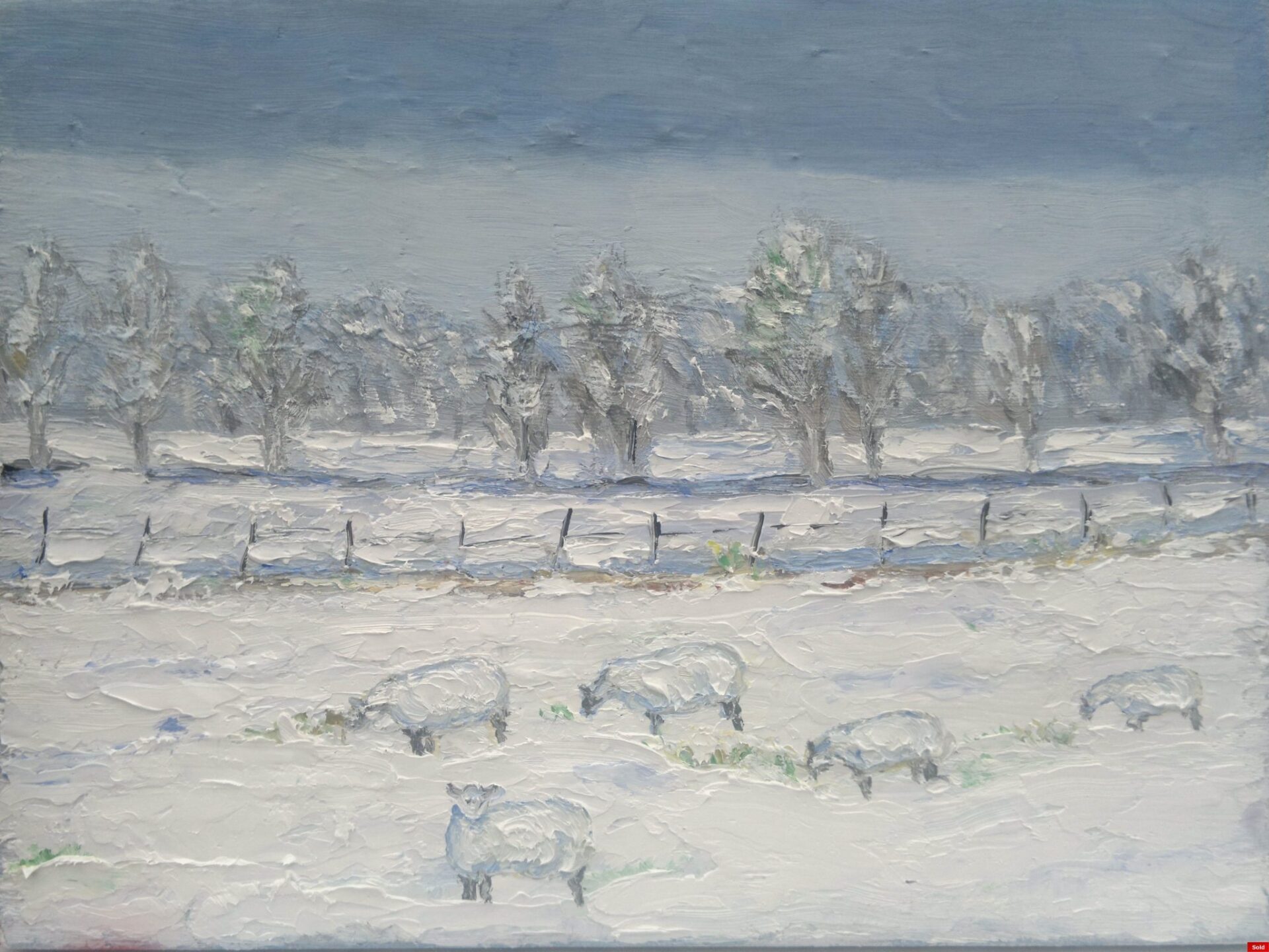 Na alle winterweer nog een keer sneeuw in februari. Schapen kunnen daar tegen. Ik schilderde Vijf schapen in de sneeuw op Walcheren.