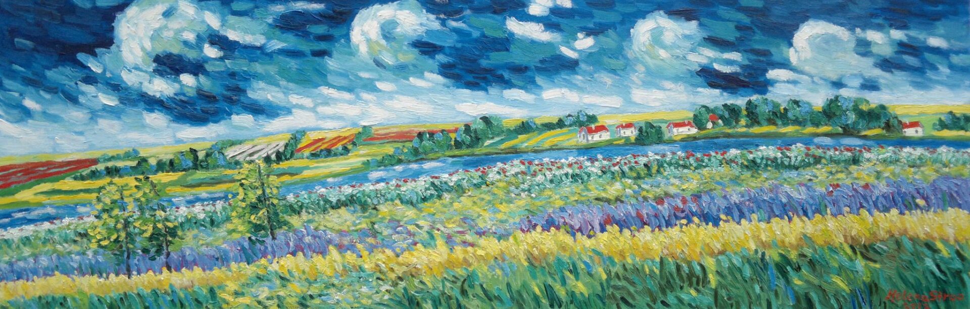 In 2013 lente met winterse tenmperaturen. Roept verlangen op naar de heerlijke zomer, waar je zo fijn buiten in de vrije natuur kubnt schilderen. Zoals dit schilderij Zomerbloei langs riviertje in Frankrijk.