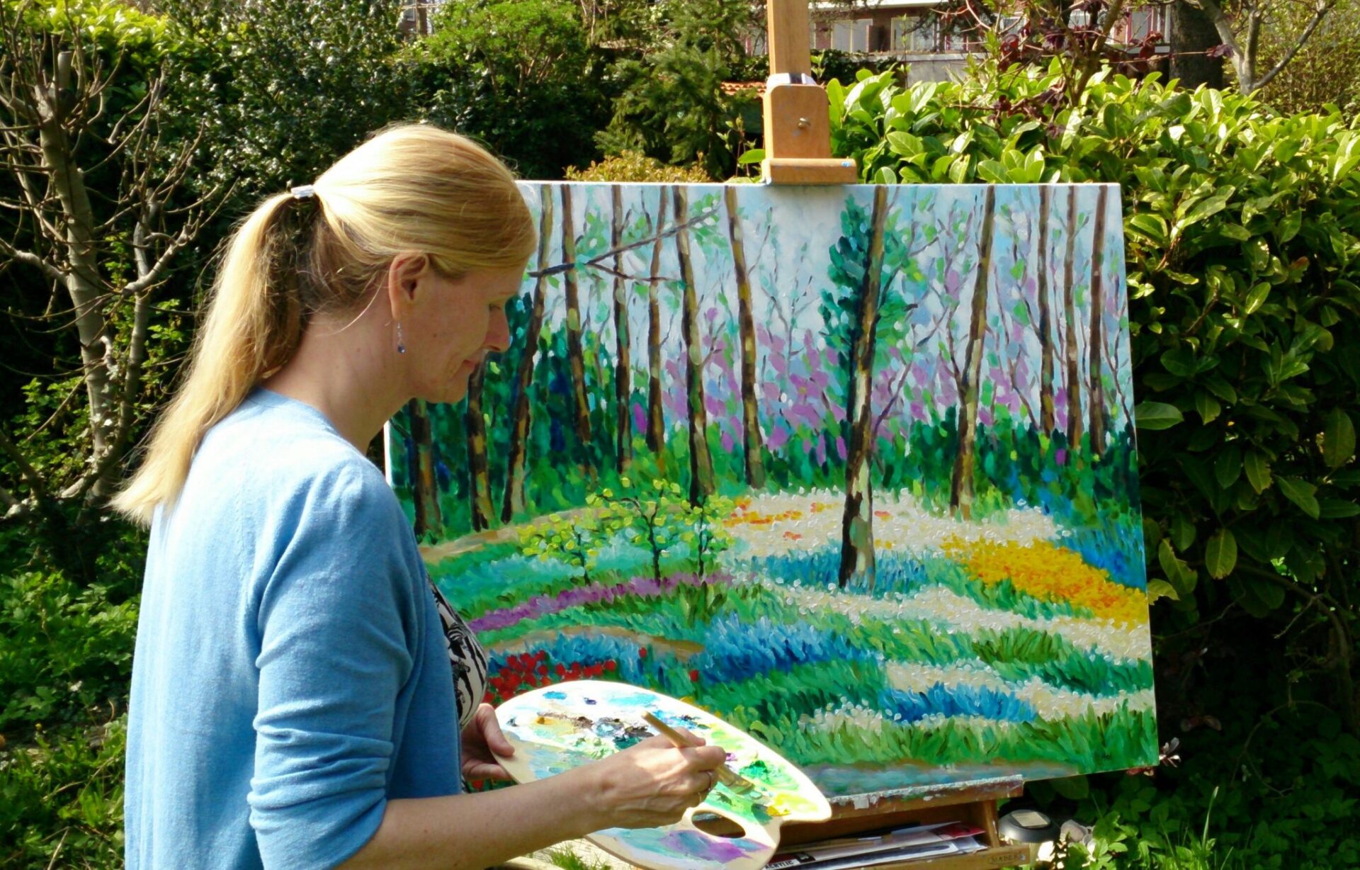 Deze week met enkele fantastische lentedagen was het heerlijk om buiten te schilderen. Hier plaats ik De laatste toetsen op het doek van Eindelijk lente, een schilderij helemaal in de sfeer van het mooie weer met alle prachtige bloesems.