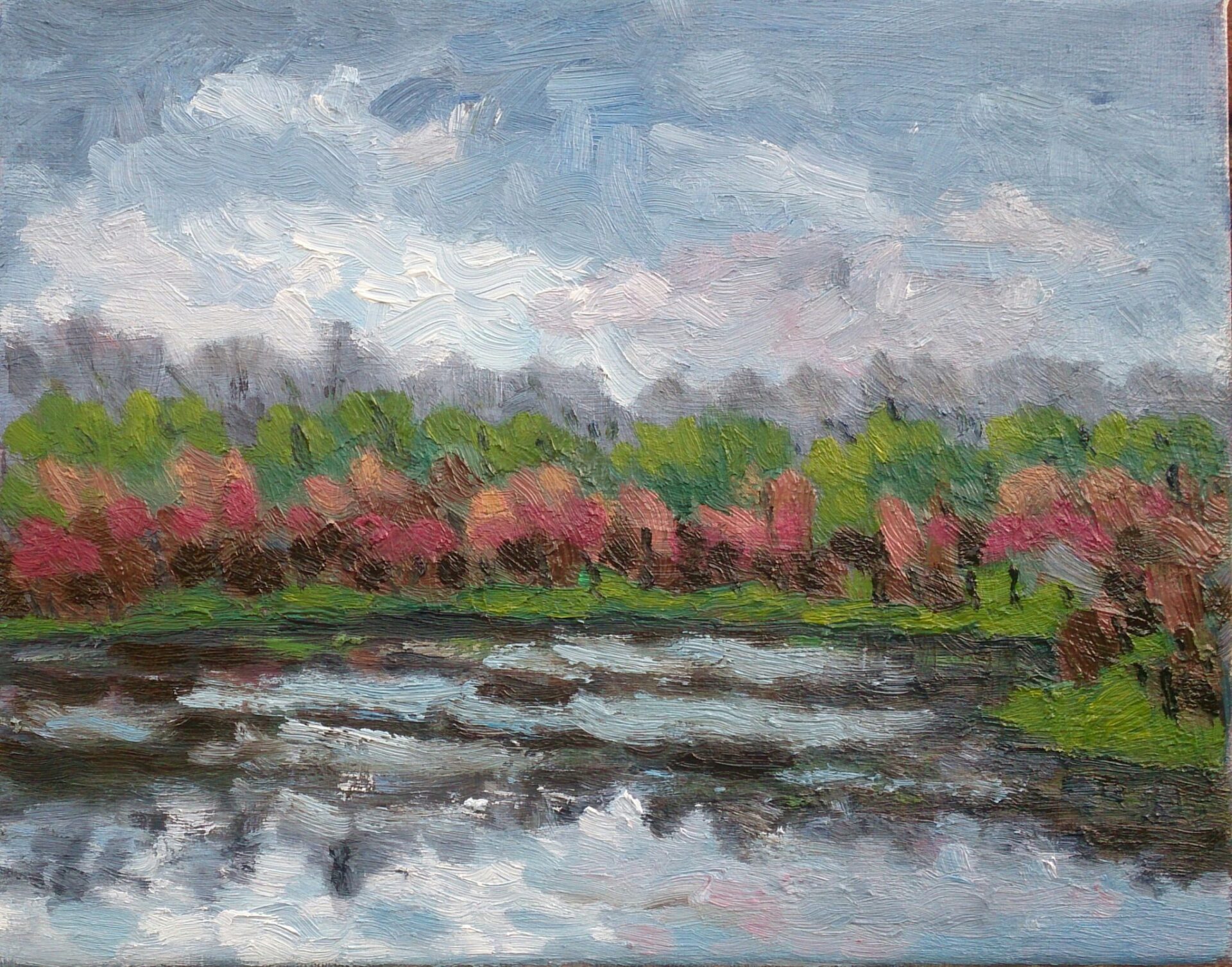 De laatste wintermaand kleurde bijna lenteachtig, zoals te zien is op mijn schilderij Kreek bij Veere in februari.