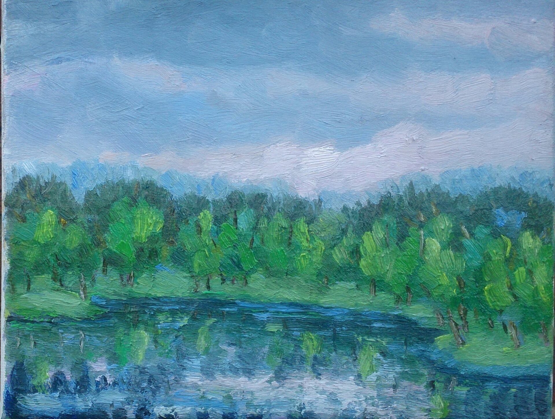 Ik schilderde de mooie vroege lente, waar bomen al groen kleuren, zoals dit schilderij van een Kreek bij Veere in maart.